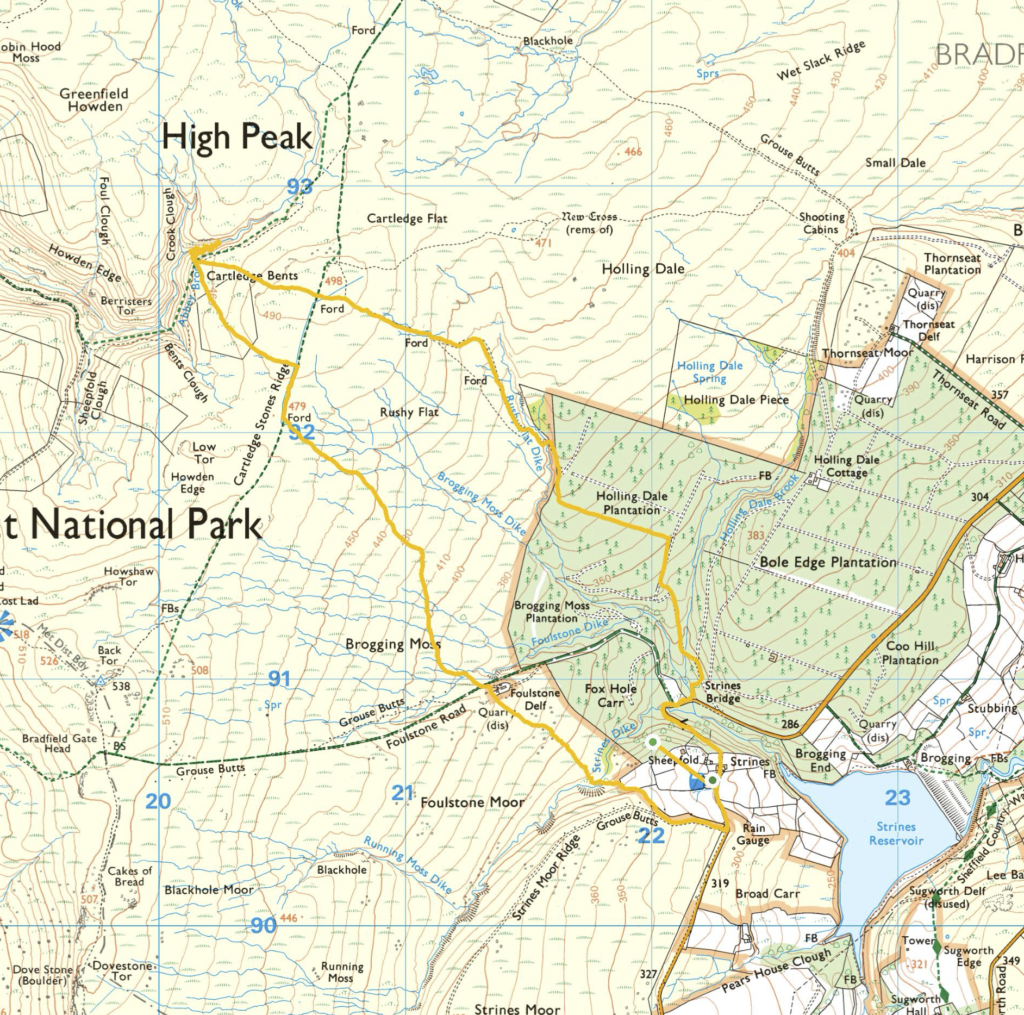 We paused at the waterfall to recover our stability and three of us came to our senses and decided to leave the trip to Berristers Tor to the fast Warts whilst Pete, Moz and I went on our way to the Blockhouse. We failed to find it mainly because our minds were scrambled by a stint of slab running which, as it turned out, was not enough because our direct line took us to the gamekeeper’s house and then on to Strines Dike before a road finish to the car park.