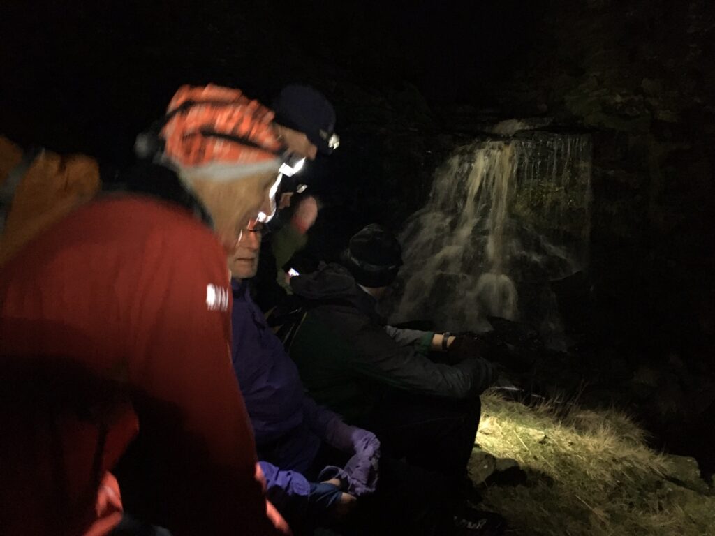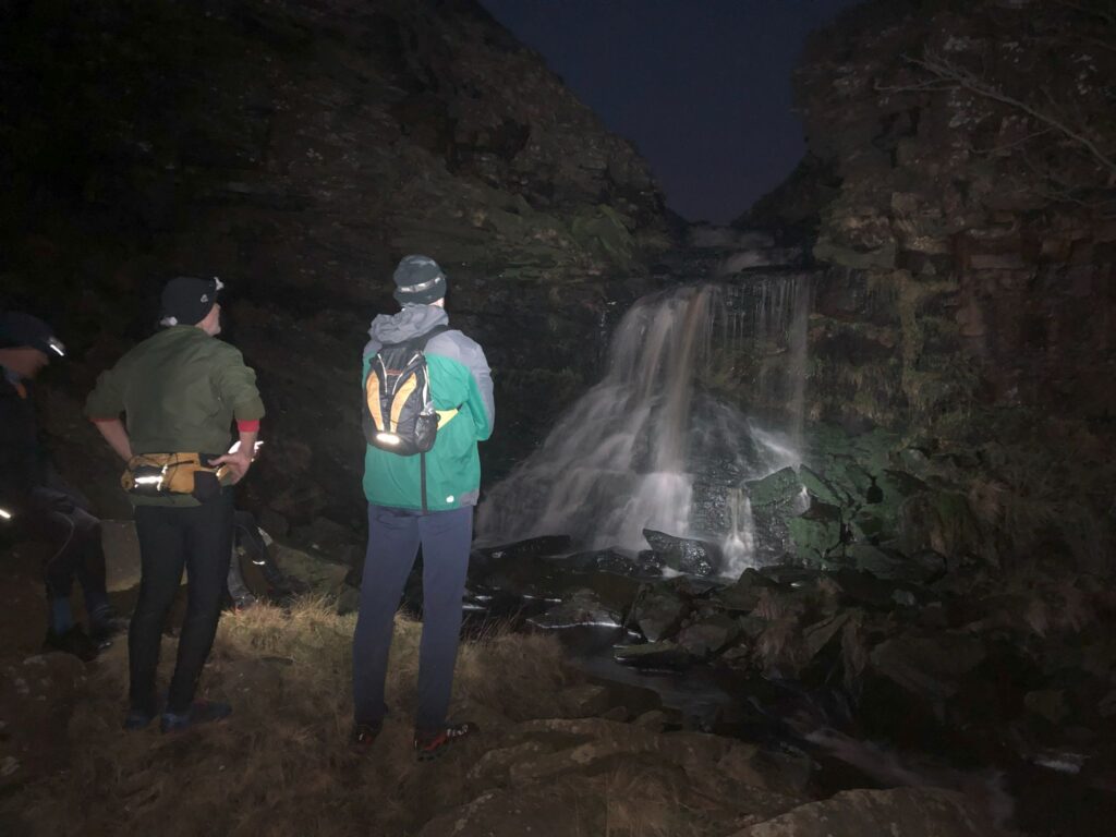 Perhaps a night of semi-chaos but also one of some achievement for which we’re thankful to all for reaching our planned check point and to Simon, for his vehicle rescue service at the Strines car park. The initial group of seven including some veterans of last Wednesday’s very wet and windy hyperthermic weather set off in cold dry conditions with the aim of reaching the waterfall at the top of Abbey Brook which we think we had missed two weeks previously. Without our Cap’n (enjoying himself in the Trough of Bowland), Tom took over navigational leadership starting on a fast track. More correctly, it was a track, yes, with fast Warts on it Tom, Tim, Simon, Dave H (a welcome return) and Pete. Moz and I followed on, hoping they would burn themselves out so we could redeem ourselves later but sadly we didn’t.