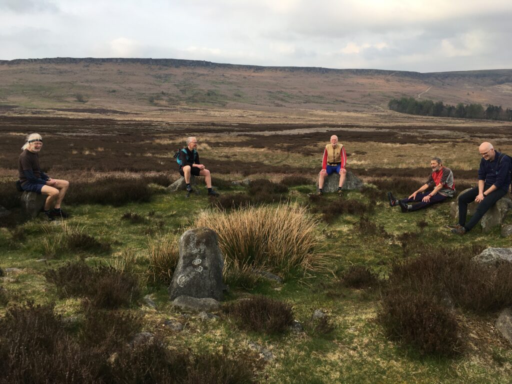 Our journey to Hordron was via Stanage Edge and a slightly trepidatious scramble up the final rocks to the Edge path. Once there, whilst we were tempted, we didn’t go to the remains of a shed but simply waved at it in our keenness to continue our admiration of the carved and numbered grouse water bowls, one of them being number 22. Unlike recent Slow Warts’ outings we were not significantly affected by much deep heather (see last week’s blog about the Cakes of Bread race), so we quite enjoyed the descent to and the crossing of Moscar Moor which included passing two pairs of stone door posts in a ruined wall, likened to some Greek mythological feature or other.