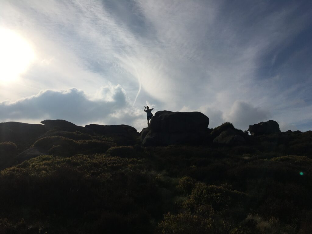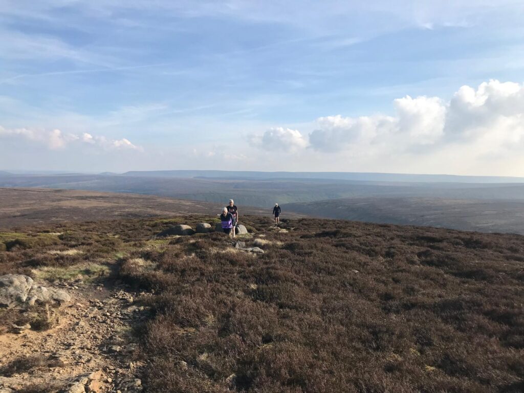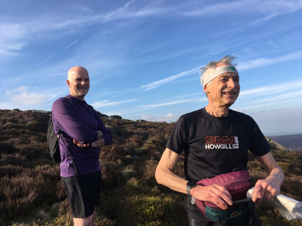 It didn’t take much for us to break into a walk, even on the long gradual climb up Linch Clough, we were, of course, just warming up our stiff limbs and rousing our hearts into athletic action (we hoped). It is a long climb especially if going to the bitter end of the clough where it peters out into heather. By this time, Jim O had decided to forsake the delights of heather bashing for his own line. He was later joined by Chris returning from his four weeks stay in Portugal where he enjoyed decorating and beach strolling, notably with no running.