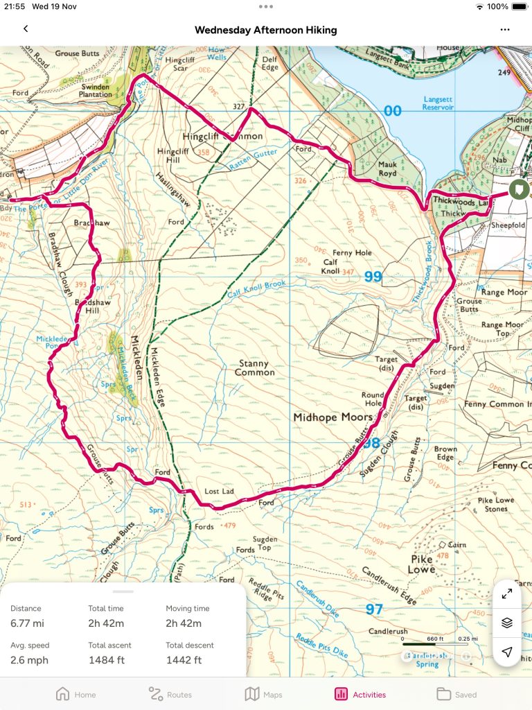 The BBC had published an article on mysterious lakes and ponds including, for example, Loch Ness and the Peak District’s Mermaid’s Pool. It failed to mention Mickledon Pond which has a distinct feeling of magic, perhaps. It is not easy to find, being hidden in a dip in the hill side and as witnessed by our wanderings (see Chris’s track) over rough ground and frequent referrals to various of our technologies. When we finally overlooked it, it was a group decision that waving at it was sufficient recognition of us reaching the Pond.