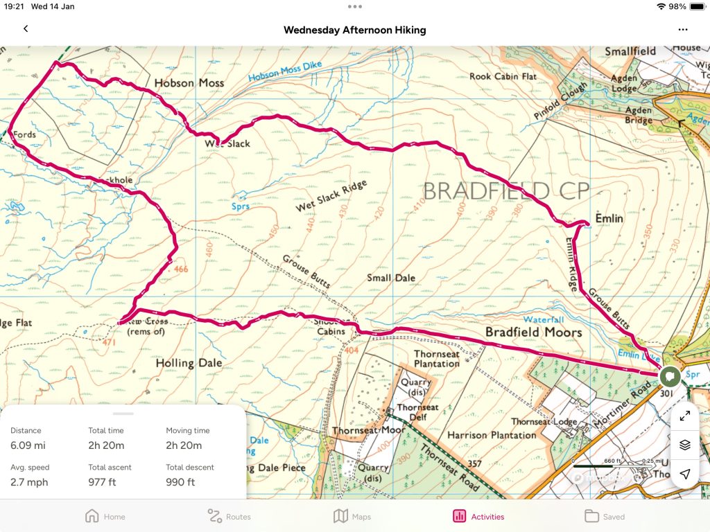 There are at least two historic monuments in the Dark Peak area which have a notable attached cache indicating their historic significance, that is, “(rems of)”. Our outing from a place variously known and discussed as Wilkin Hill, Windy Hill and the gas station included one such monument, New Cross (rems of). Having battled against a strong cold westerly wind some thoughts turned a bit morbid with Tom suggesting that his ashes should be scattered at New Cross with the added note, “(rems of Tom Westgate)”.