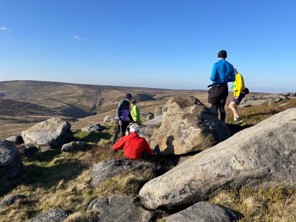 A long stretch of moorland awaited us to Low Tor with the possible questionable relief of the slabs on the path which, like us are showing their age as they sink in to the peat. Many of them are leaning at crazy angles which, I suppose is only what we’re doing when crossing the lumpy moor. Leaving the path, we followed the fence and headed to Low Tor where we’re impressed by the, dare I say, the spectacular view towards Margery Hill and beyond. We turned almost sentimental by our opportunity of being out in the heart of the Dark Peak.