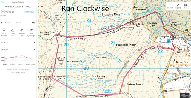 Start/Finish Strines Inn top carpark. Out by Strines Moor Edge and boundary stones to Dove Stone. Return by Derwent Edge, Foulstone Road and Mortimer Road. Full route on map.