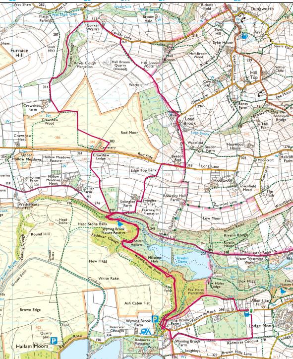 The proposed route is below, variations always possible following a conflab in the hut. Out via the 3 Merry Lads / top path and then down Wyming Brook Drive. From here across the farmers fields to Rod Moor trig point, Royds clough, then back. Due forestry operations we shall return via Swinglee Farm and reach the end of Wyming Brook Drive, retracing our steps as far as the top of Wyming Brook, and then return via conduit path.