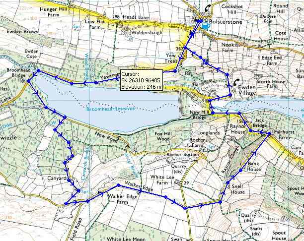 Start/finish Bolsterstone Church. Descend Yewtrees Lane and over Broomhead Bridge at west end of Broomhead Reservoir; first left after bridge and then first right and uphill past Canyards; left onto Walker Edge before descending past Snell and Bank House to turn left past Jack Bridge, across New Mill Bridge, and then bearing left steeply up hill to finish at church. Full route on map.