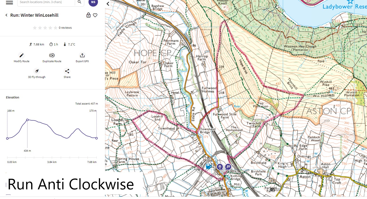 Start / Finish at stile onto Edale Road. Cross road, over Killhill Bridge and under railway bridge before climbing through Twitchill Farm to Thornhill Brink. Follow Hope Brink northwest before descending south to Fullwood Stile Farm, then left at Edale Road across Townhead Bridge. Right on tarmac and right again before Townhead over stile onto rising track to Losehill End. Follow top wall to just shy of Losehill Farm, then southeast through series of stiles and over bridge above railway track before turning left at path junction down narrow path between walls to start point. Full route on map, and worth a day-time recce.